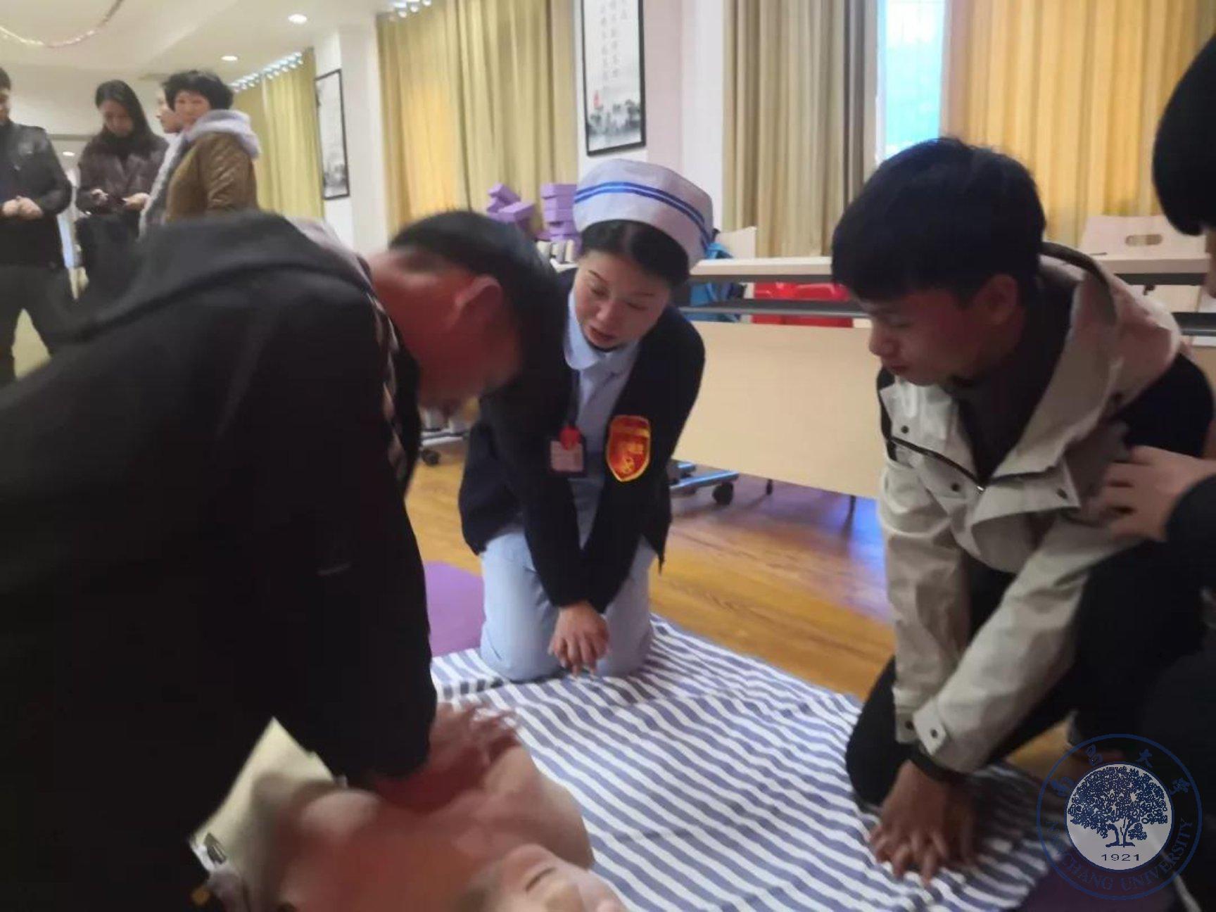 培训课上,医护人员对 “心肺复苏——基础生命支持”的理论知识、急救的整个流程及注意事项进行了详细的讲解,演示了气道异物的处理方法、外伤包扎止血法。在模拟练习环节,现场参训的志愿者们积极参与,掌握心肺复苏动作要领、正确处理气道异物、包扎止血等,提高应对突发情况的处理能力。