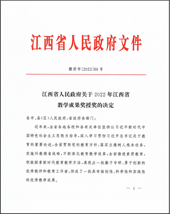 本网讯(第一附属医院)近日,江西省人民政府颁发了关于2022年江西省教学成果奖授奖的决定。南大一附院(第一临床医学院)3项成果获教学成果奖,获奖数量位列全省各医院第一,南昌大学医学院第一。该类奖项是省内首次由江西省人民政府表彰的教学成果奖励项目,由省教育行政部门组织实施,每四年评审一次,是我省高等教育领域意义重大、影响深远的奖项,代表了我省教育教学改革理论和实践创新的前沿探索、经验总结的重要成果。
