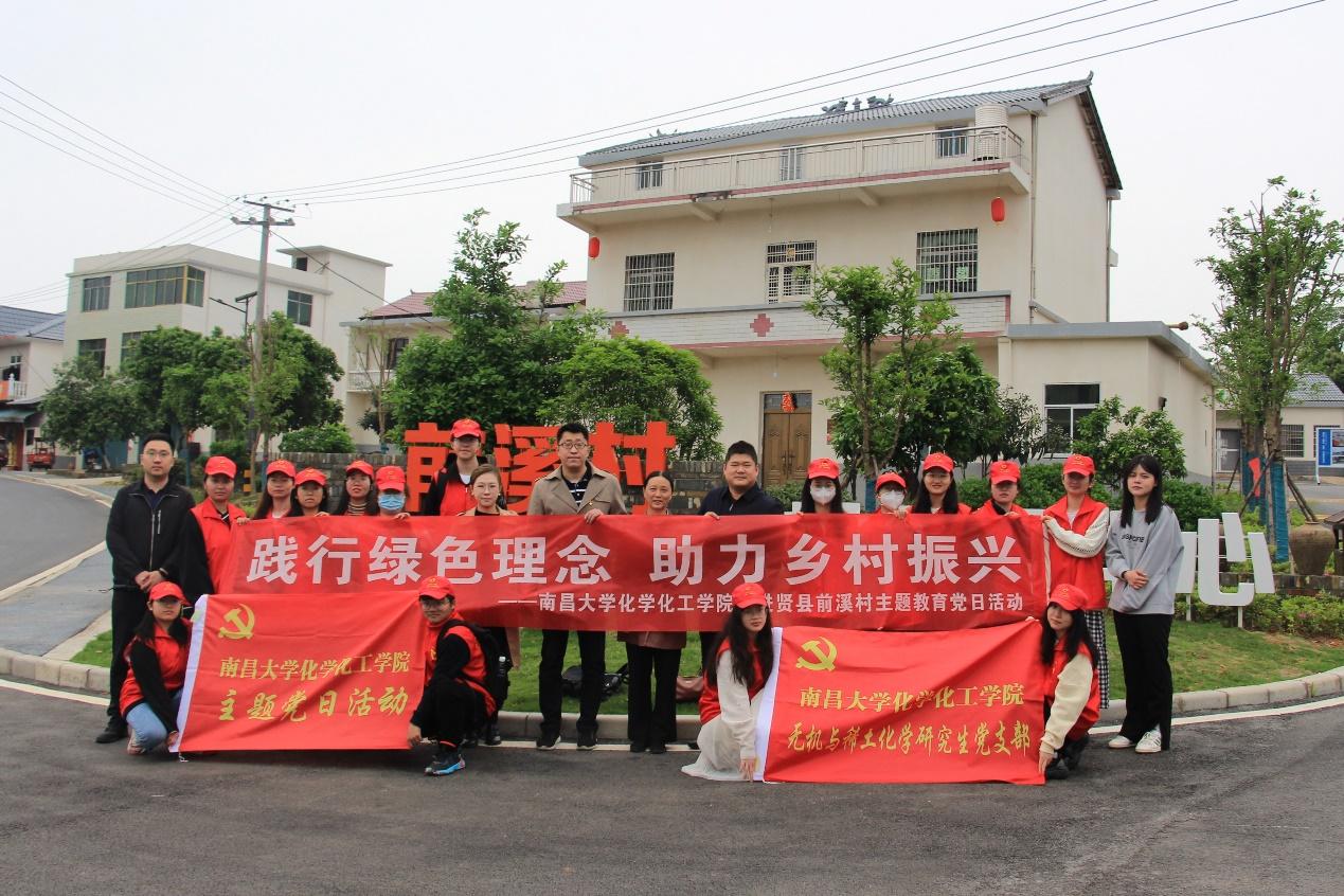 本网讯(化学化工学院)为牢牢把握学习贯彻习近平新时代中国特色社会主义思想主题教育“学思想、强党性、重实践、建新功”的总要求,践行习近平生态文明思想,提升青年师生到基层锻炼、向基层学习、为基层服务意识和能力,4月22日,在第54个世界地球日到来之际,南昌大学化学化工学院党委“双带头人”支部书记工作室组织无机与稀土研究生党支部、本科生青团支部党员代表一行18人,在学院党委书记舒涛、无机与稀土研究生党支部书记熊威及研究生辅导员兼党务秘书谢晨彬的带领下,前往进贤县泉岭乡前溪村,与共青团南昌市委驻进贤县泉岭乡前溪村工作队联合开展“践行绿色理念、助力乡村振兴”主题教育党日活动。