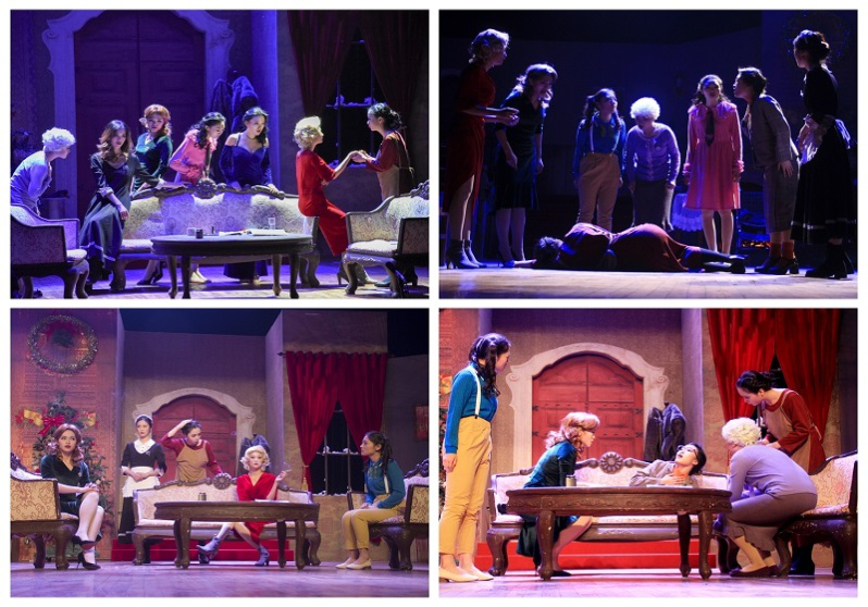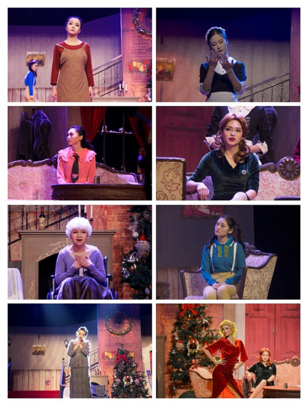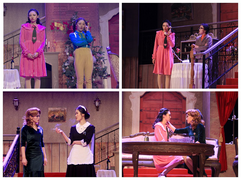 各学院的观众慕名而来,表演现场座无虚席,过道上也挤满了想要一睹风采的同学。印花墙纸、复古桌椅、欧式门窗……为了上演这部上世纪七八十年代法国乡村背景的经典佳构剧,音乐厅舞台被布置成有法国特色的别墅客厅内景,从视觉上将观众们带入到戏剧当中。台上道具齐全,演员们穿着各具特色的服装,传达着不同的身份信息:身着礼服的盖比太太气度雍容,戴着黑框眼镜的奥古斯丁小姐保守传统,穿着背带裤的卡瑟琳俏皮灵动……8 个女人表情各异,都有自己标志性的小动作,展现出她们不同的性格。灯光亮起,故事展开,8 个女人的矛盾与争纷开始了,一场由谎言编织的闹剧拉开帷幕。舞台上的她们仿佛被赋予了新的灵魂,盖比太太的高跟鞋锋利而闪耀,皮瑞特优雅地把玩着高脚杯,奥古斯汀小心翼翼地向路易斯求教……