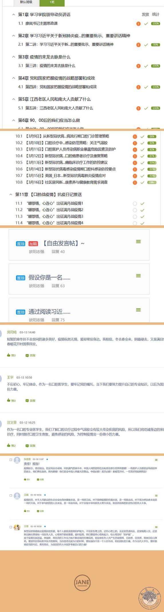 本网讯(附属口腔医院)截止3月16日,在十天的时间里,南大口腔医学院开展研究生中国战疫大思政主题思政课反响热烈,南大规定的各章节学习完成进度均达到90%以上,开课一周访问量6132,发表主题讨论4次,发布作业4次,在规定时间内作业完成率接近100%,学生参与讨论数292次。
