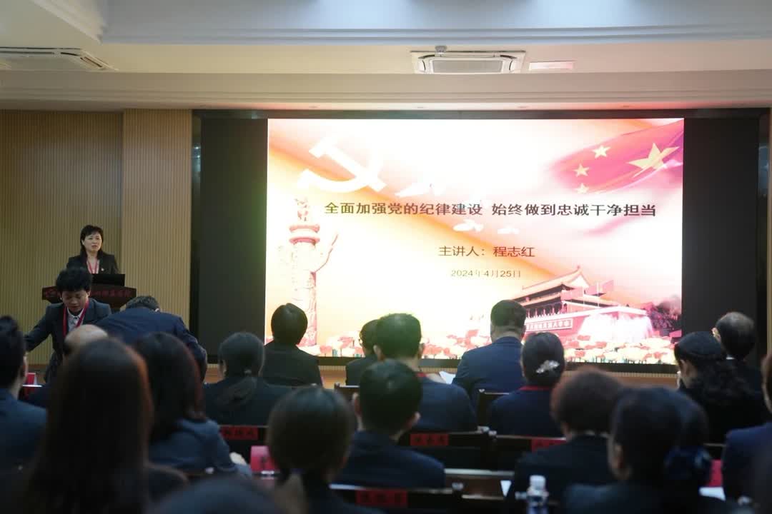 程志红以“全面加强党的纪律建设 始终做到忠诚干净担当”为题,从学思想,强党性,自我革命在路上、知纪律,明规矩,遵规守纪作表率和守初心、担使命、坚定信念强本领三个方面,细致解读了《中国共产党纪律处分条例》(以下简称《条例》)修订内容,深刻讲述了党纪学习教育的重大意义和目标要求。她要求,各党支部要组织党员特别是党员领导干部认真学习《条例》,搞清楚党的纪律规矩是什么,弄明白能干什么、不能干什么。要把学习融入日常、抓在经常,坚持逐章逐条学、联系实际学,抓好以案促学、以训助学,推动《条例》入脑入心,深化《条例》理解运用,教育引导党员干部准确掌握《条例》的主旨要义和规定要求,明确日常言行的衡量标尺,把遵规守纪刻印在心,内化为言行准则,进一步强化纪律意识、加强自我约束、提高免疫能力,增强政治定力、纪律定力、道德定力和抵腐定力,始终做到忠诚干净担当。