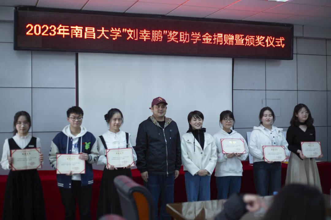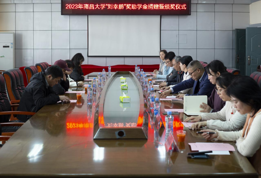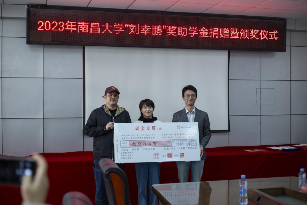 本网讯(食品学院 杨佳能)3月7日下午,南昌大学“刘幸鹏”奖助学金捐赠暨颁奖仪式在理生楼A210会议室举行。宜春十九度电子商务有限公司董事长,母婴食品头部品牌秋田满满创始人刘幸鹏、刘田妹夫妇,校友办、校资助中心及食品学院有关负责同志参加了本次活动。