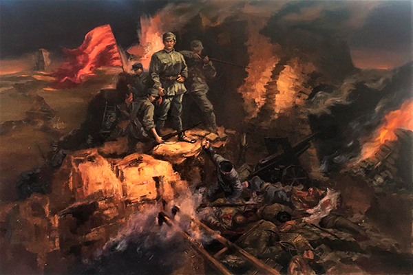 长城抗战是九•一八事变后中国军队在华北大地上进行的第一次较大规模的抗击日本侵略者的战役。《长城永不倒》这幅作品用笔粗重,大篇幅的暗色笔触与屹立不倒鲜红旗帜形成鲜明对比,体现了抗日战争的残酷和抗日战士的英勇。整幅色调显得十分壮烈、凝重但充满力量,抗日战士的尸体垫起城墙的缺口,存活的战士手中紧握大刀、木棒、枪杆,人物表情凝重坚定,表现出一种视死如归的大无畏精神。