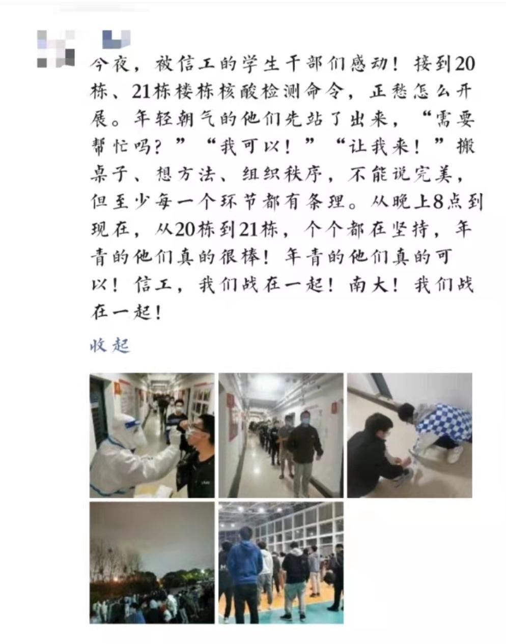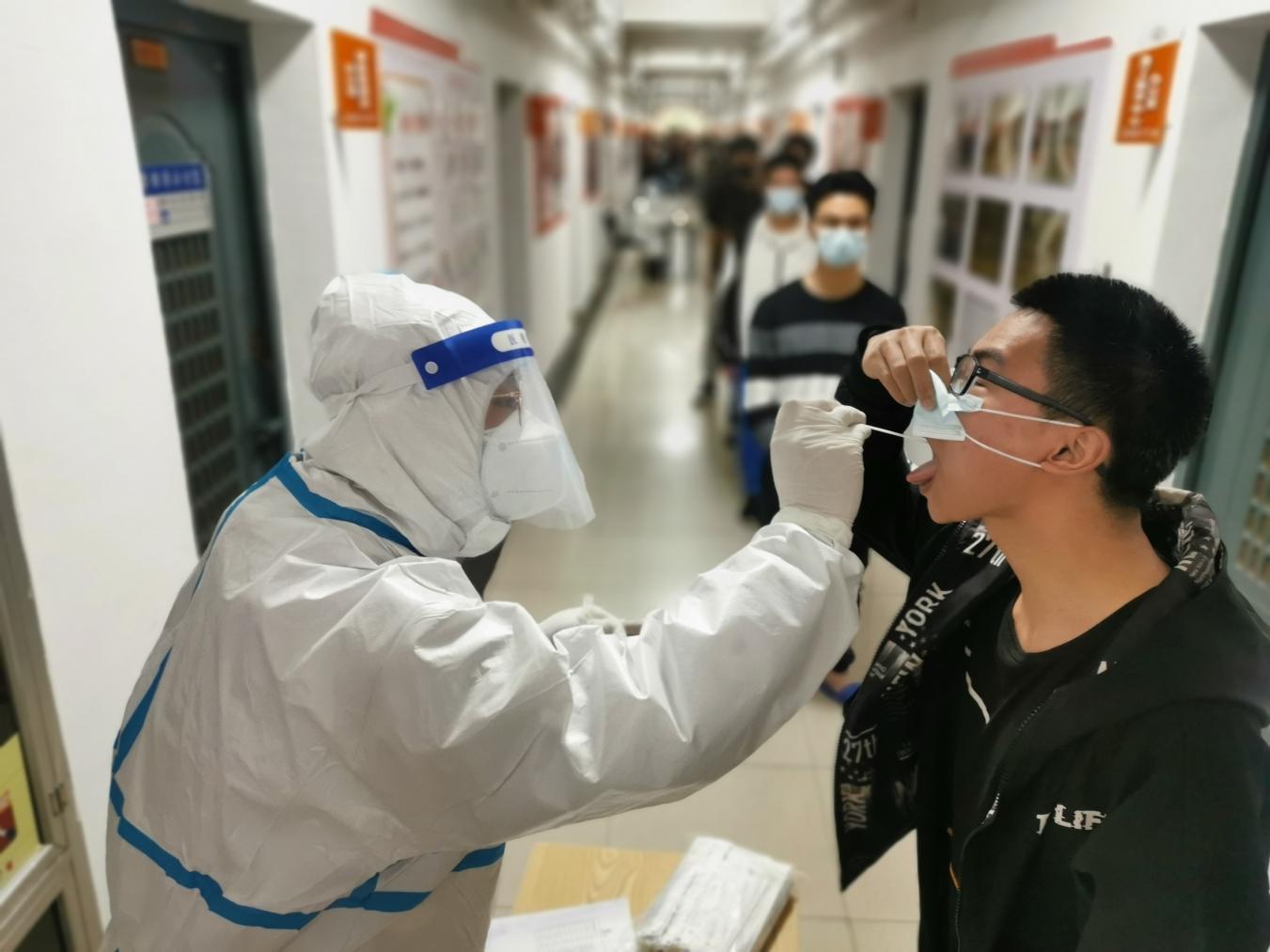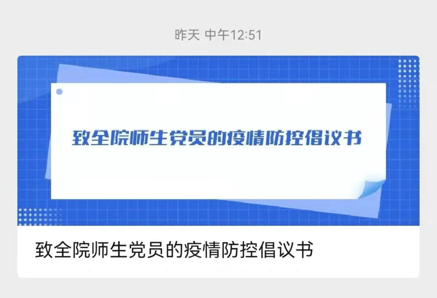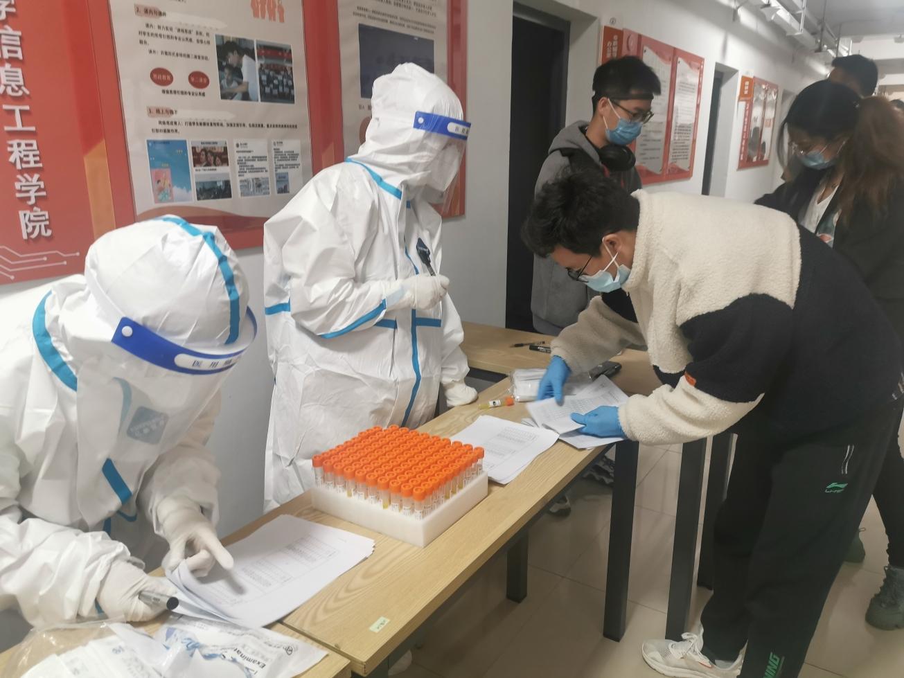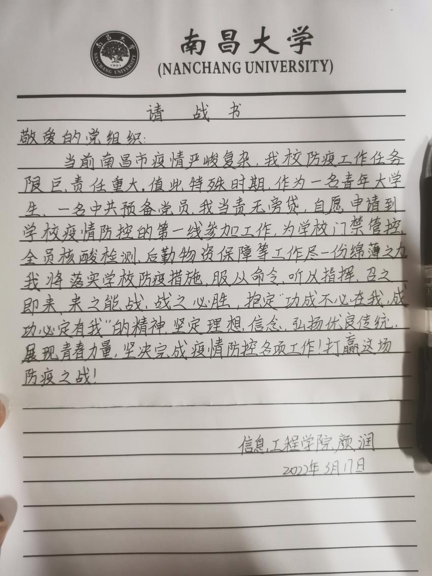 3月17日,学院向全体师生党员发出了一封《致全院师生党员的疫情防控倡议书》。不到一个小时,便有学生写下请战书。当晚,共有40余名师生党员、入党积极分子、学生骨干主动请缨,主动承担起在20栋、21栋的核酸检测工作,服务五个学院共2100余位学生。