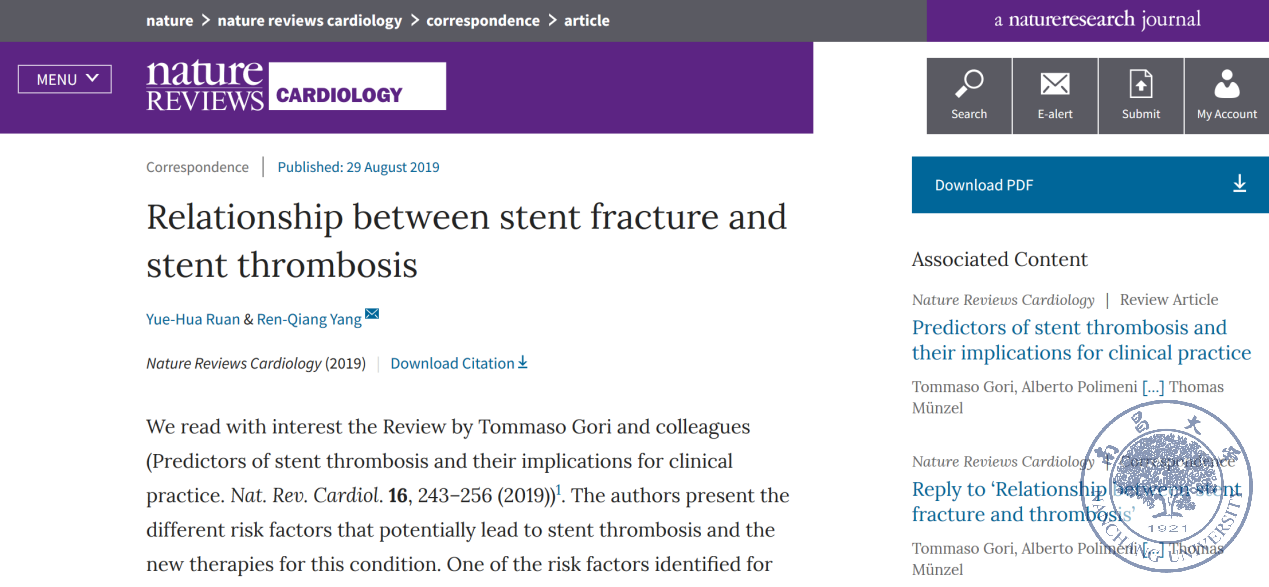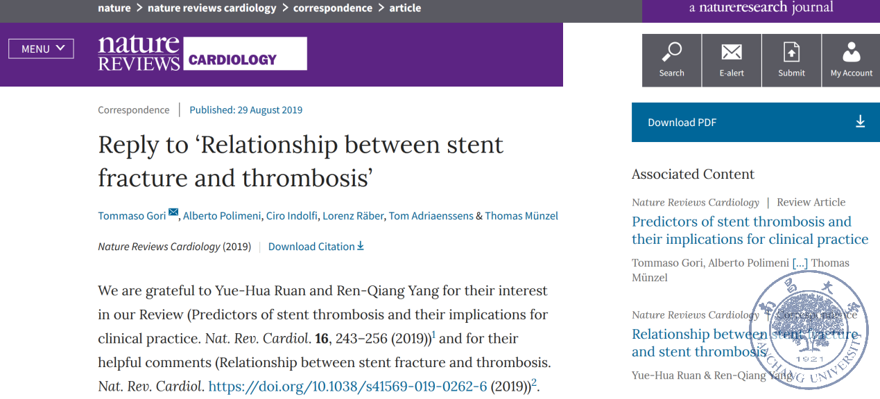 南昌大学二附院心内科杨人强教授团队结合自己的研究,针对其中有关冠脉支架断裂与支架血栓形成的论断进行质疑,得到作者及杂志编委会的高度认同。南昌大学二附院阮月华医师在杨人强教授的指导下,全面分析了该院2012年1月到2017年12月2098例行冠脉支架植入患者的资料,平均随访2.5年,发现支架断裂的风险并不像文章中所说的那么严重。他们将研究结果与文章作者及杂志社编委讨论沟通后,得到他们的高度认可,并于2019年8月29日被《Nature review cardiology》杂志录用发表(https://doi.org/10.1038/s41569-019-0262-6),论文的作者Tommaso教授也专门就此进行了感谢。