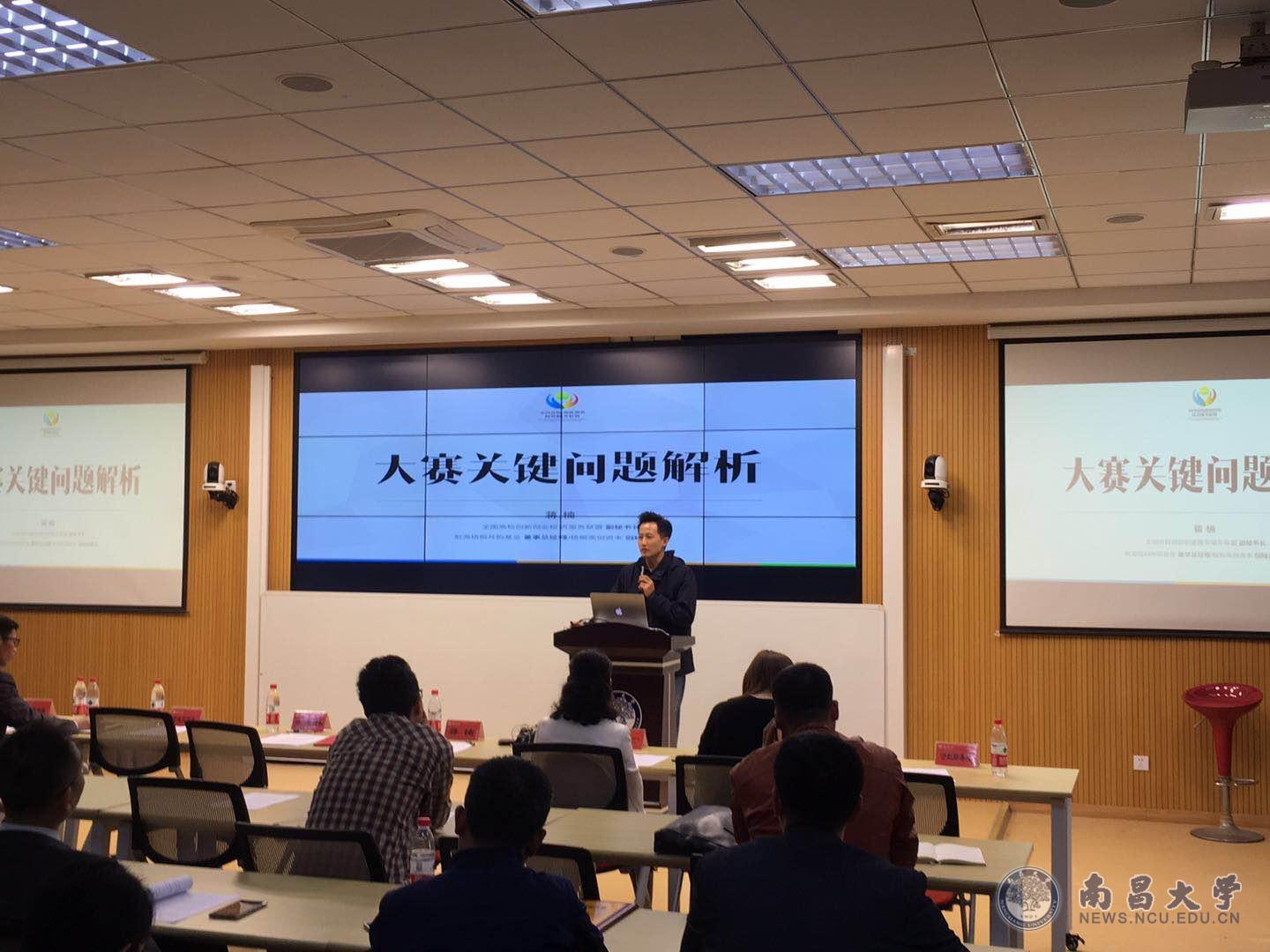 会上,蒋楠作“大赛关键问题解析”的报告。他围绕大赛的目的与任务、总体安排、项目要求、比赛赛制、大赛奖励等内容,对本届“互联网+”大学生创新创业大赛政策进行了解读和阐释,为我校当前阶段备赛工作提出整体策略与建议。他以“互联网+”大学生创新创业大赛金奖项目为案例,探讨导师的定位和使命,为教师在指导参赛项目中发挥引领作用,提出了建议,并鼓励大学生群体要积极参与到创新创业实践中,为梦而赛,为爱而创。