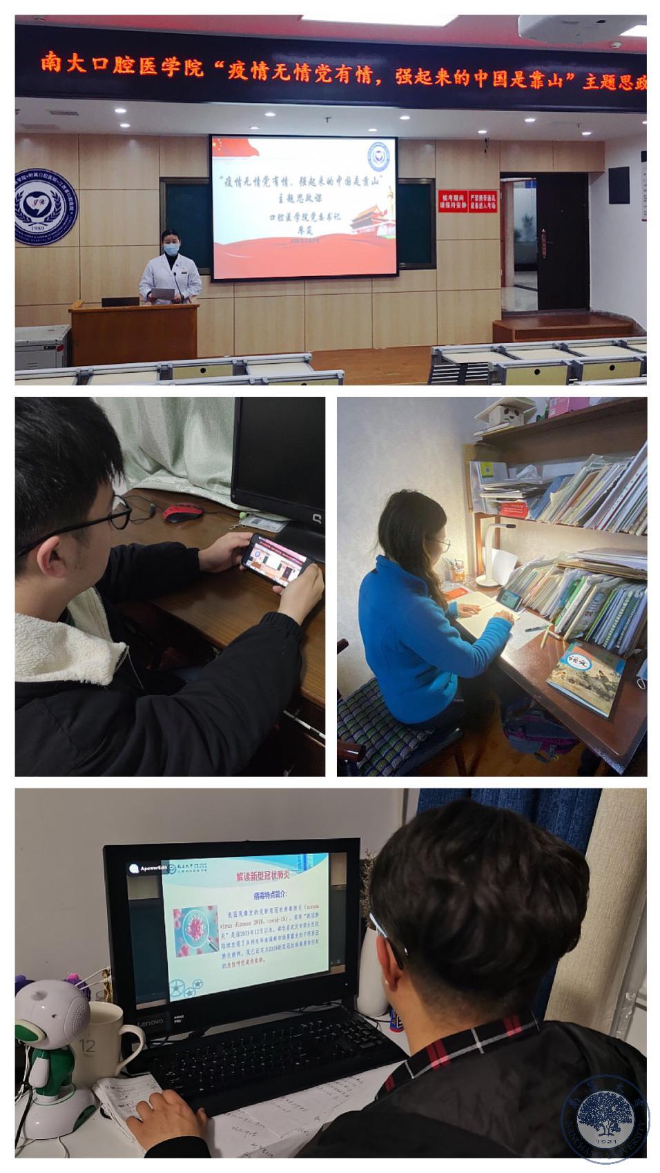 本网讯(口腔医学院)为认真贯彻落实习近平总书记关于新冠肺炎疫情防控工作的重要讲话和指示精神,全力支持配合打赢疫情防控人民战争、总体战、阻击战,坚定口腔医学生爱国力行的使命责任,自3月3日收到学校《关于开展研究生主题思政课教学的通知》后,口腔医学院全院上下一盘棋,扎实做好疫情防控期间“疫情无情党有情,强起来的中国是靠山”主题思政课各项教学准备工作,并顺利实施。