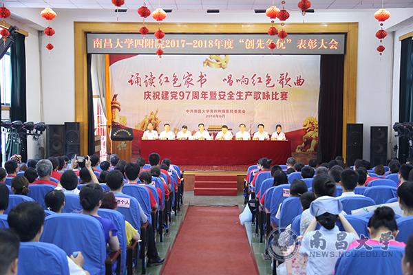 本网讯(第四附属医院)6月28日,为庆祝党的97岁生日,第四附属医院表彰了2017-2018年度“创先争优”活动中涌现的先进集体和先进个人,举行了重温入誓词、诵读红色家书、唱响红色歌曲活动。