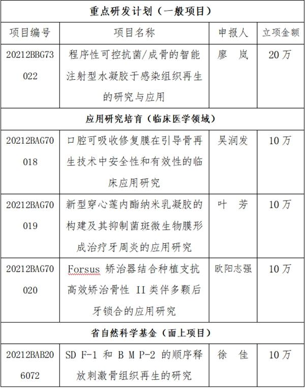 本网讯(附属口腔医院)11月12日,江西省科学技术厅关于下达 2021 年省级科技计划项目(第二批)的通知,南昌大学附属口腔医院五位教师喜获省级科研项目,总经费60万元。