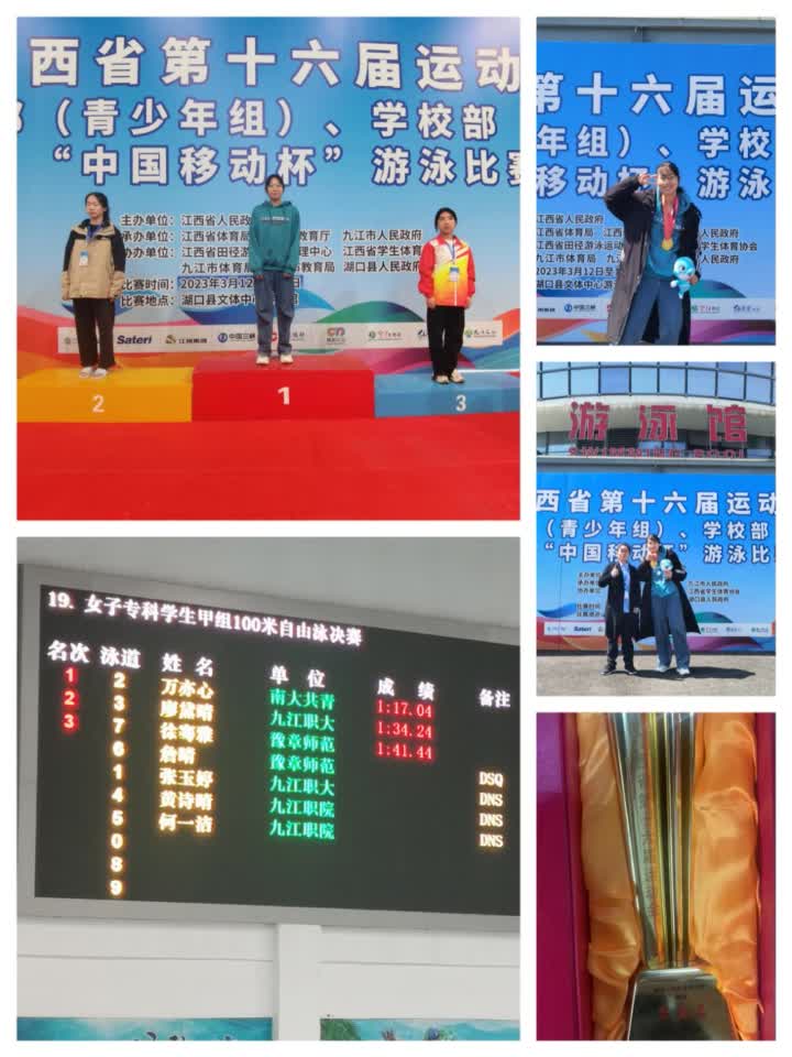 南昌大学共青学院学子积极参与,努力拼搏。中文与教育系21级中文专业万亦心同学包揽女子专科学生甲组50m自由泳决赛、女子专科学生甲组100m仰泳决赛、女子专科学生甲组100m自由泳决赛三块金牌,我院获得游泳(学校部高校组)团体第五名。此次比赛充分展现了共青学院学子的良好精神面貌与体育运动竞赛的强劲实力。学院将以此次省运会比赛为契机,不断深化体教融合、释放育人活力,帮助我校师生锤炼体育精神、掌握运动技能、享受运动乐趣。