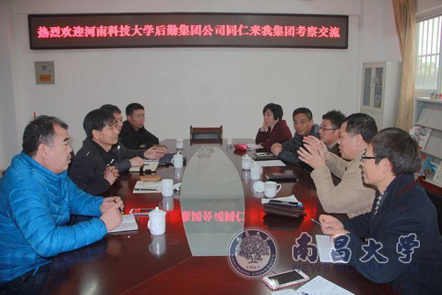 本网讯(后勤服务集团)1月18日,河南科技大学后勤集团公司副总经理阎兴斌一行4人到南昌大学后勤服务集团进行调研交流,我校有关负责人就后勤服务集团基本情况、资产管理、教室管理、修缮管理,以及对外包物业、餐饮服务、安全防范、能源保障等作了介绍。双方就相关问题进行了友好亲切的沟通交流。