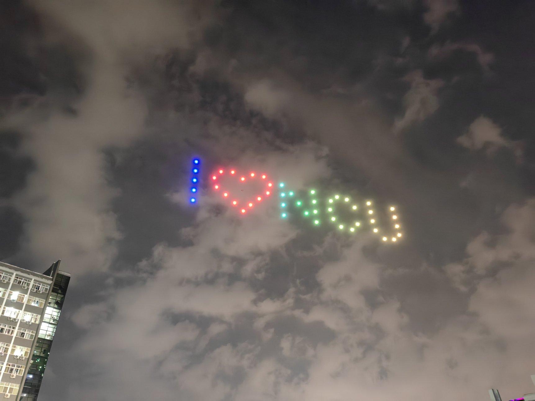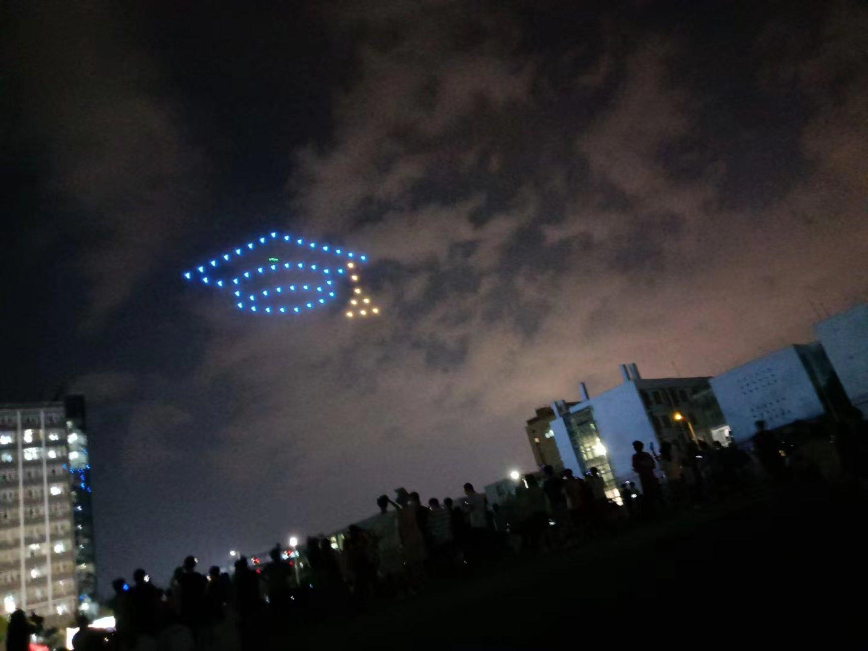 毕业不散场,回忆无终章。和着《追光者》的悠扬旋律,由江西空中未来创新科技有限公司带来的无人机表演让整场音乐会达到了最高潮。50架无人机在空中闪烁着迷人的灯光,分别组成“2018”“香樟树”“2022”“纸飞机”“”I ♥NCU”“I ♥XG”“一帆风顺”等字样或图案。毕业生们纷纷举起手机,将这份属于他们的特殊礼物记录珍藏。