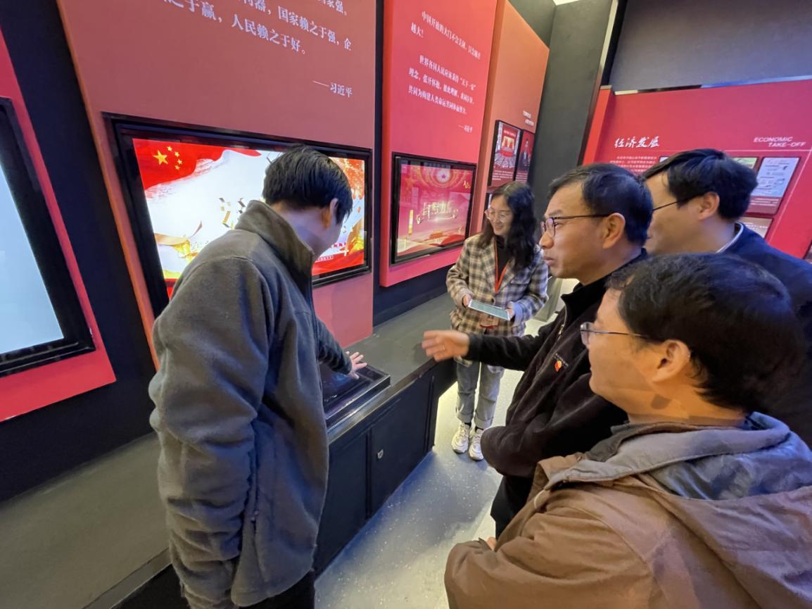 学院党史学习教育领导小组成员跟随讲解员的步伐,参观了红色文化馆“站起来,富起来,强起来”三个篇章,“红色文化馆”借助多媒体手段,营造出光、声、电全方位,视、听、触多感官的立体化体验感受,客观的再现中国近现代历史的沧桑,以及十八大以来中华民族为实现伟大复兴,从“富起来”到“强起来”的伟大历程。