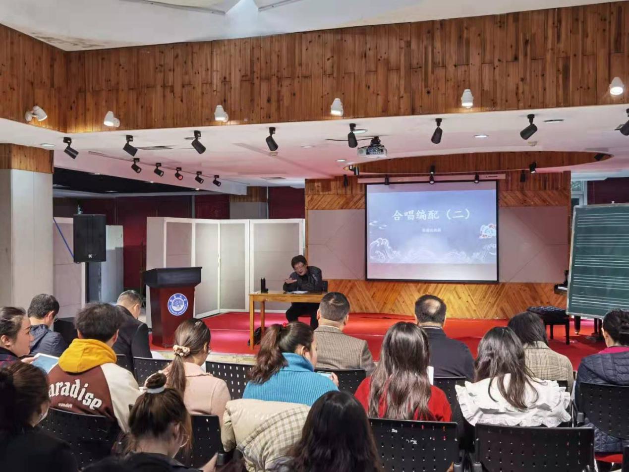此次讲座主要讲授了合唱编配的基本手段以及合唱编配的再创作。陈教授以二声部合唱编配为例,向师生们讲述了二声部音程的和声属性、调式属性等。在谈及合唱编配的再创作时,陈教授以《同桌的你》《生死相依我苦恋着你》及《鳟鱼》(舒伯特曲)为例,通过对声部、记谱法、音程、合唱织体、节拍发展等合唱编配要素的分析,深入浅出地对作品进行了讲解,启发听众理解作品的深层情感意蕴。陈教授的讲座旁征博引、融会贯通,其深厚的艺术素养及严谨的治学态度,感染了在场的师生。
