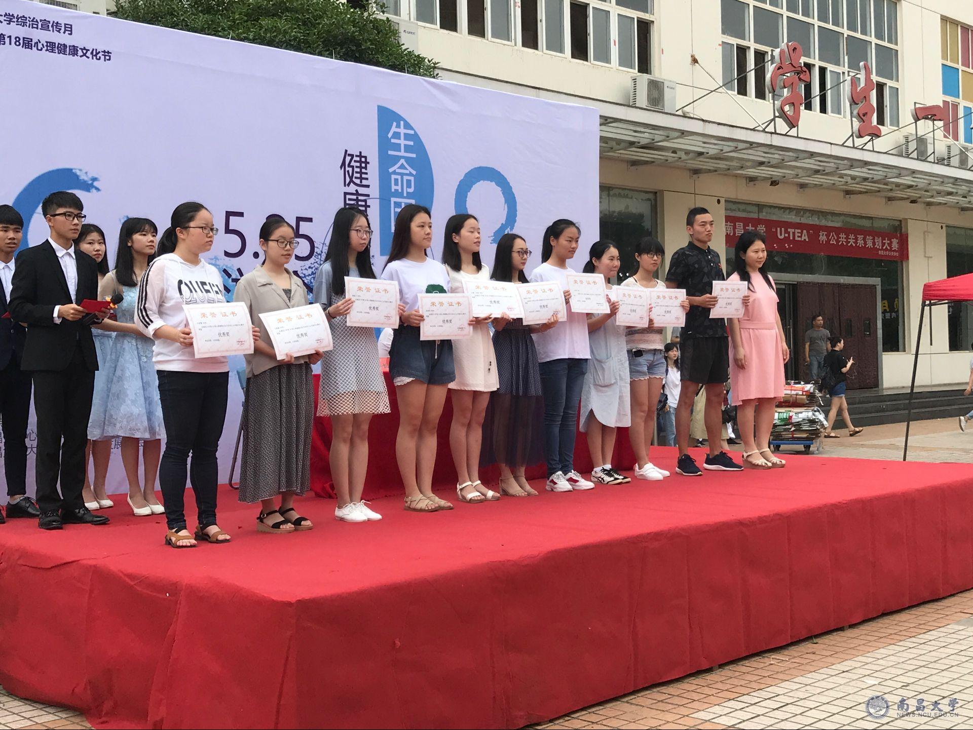 根据南大综治办函〔2018〕14号文件精神,心理健康教育中心组织专家评委和学生对各学院的心灵超市和学院自主开展的心理健康教育活动进行综合评比,评出集体一等奖3个,二等奖5个,三等奖7个;心灵艺术品个人一等奖5名,二等奖6名,三等奖7名,优秀奖8名,领导和老师对获奖的26名优秀作品的作者颁发了荣誉证书。